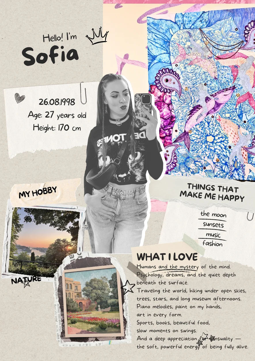 ✨ About Me ✨ I’m a free spirit with a curious heart and a love for discovering both the world and myself. Traveling inspires me — new places, new cultures, new perspectives always teach me something meaningful. I genuinely love connecting with people from different backgrounds and hearing their stories. There’s something beautiful about building connections that cross borders. Art, creativity, and self-expression are a big part of who I am. I’m passionate about anything that allows emotion and imagination to come alive. Most of all, I value making people feel seen, appreciated, and supported. I believe energy is everything — and I always try to bring warmth wherever I go.